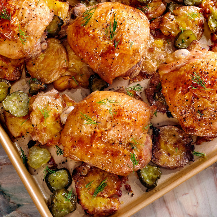 Pickle-Brined Chicken Thighs with Crispy Smashed Potatoes