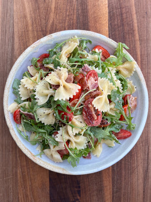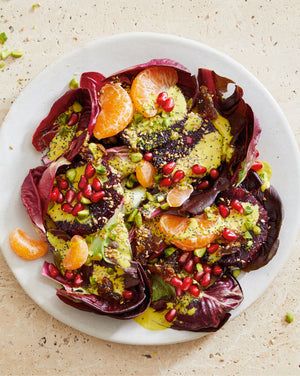 File under kinda-sorta-healthy recipes that you'll actually want to eat: We're doing our spin on a classic chicken Caesar salad, but with a Chrissy twist. It starts with homemade sourdough croutons that get baked up with salt, pepper and Parmesan cheese. Then, a delicious green goddess dressing made with fresh herbs like cilantro, basil, and parsley, mixed with buttermilk, garlic, lemon juice and mayo (bc it's only kinda-sorta healthy). Then, our secret ingredient: a dash of fish sauce to add umami and salinity (instead of the anchovies typically used in a classic Caesar dressing!). Brush it onto chicken breasts as they char up on our Lowkey Lavender Grill pan! Garnish with more Parmesan cheese, croutons and serve. Salad never tasted this good!