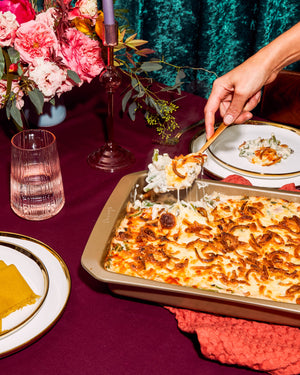 I still like my creamy version better, but I am coming around to Johnny’s casserole-style mac 'n' cheese, which doesn’t require you to make a separate sauce and may—aren’t I kind?—just sit a little better on a buffet. It has a cheesy crust that gives you that good, good cheese pull, too.