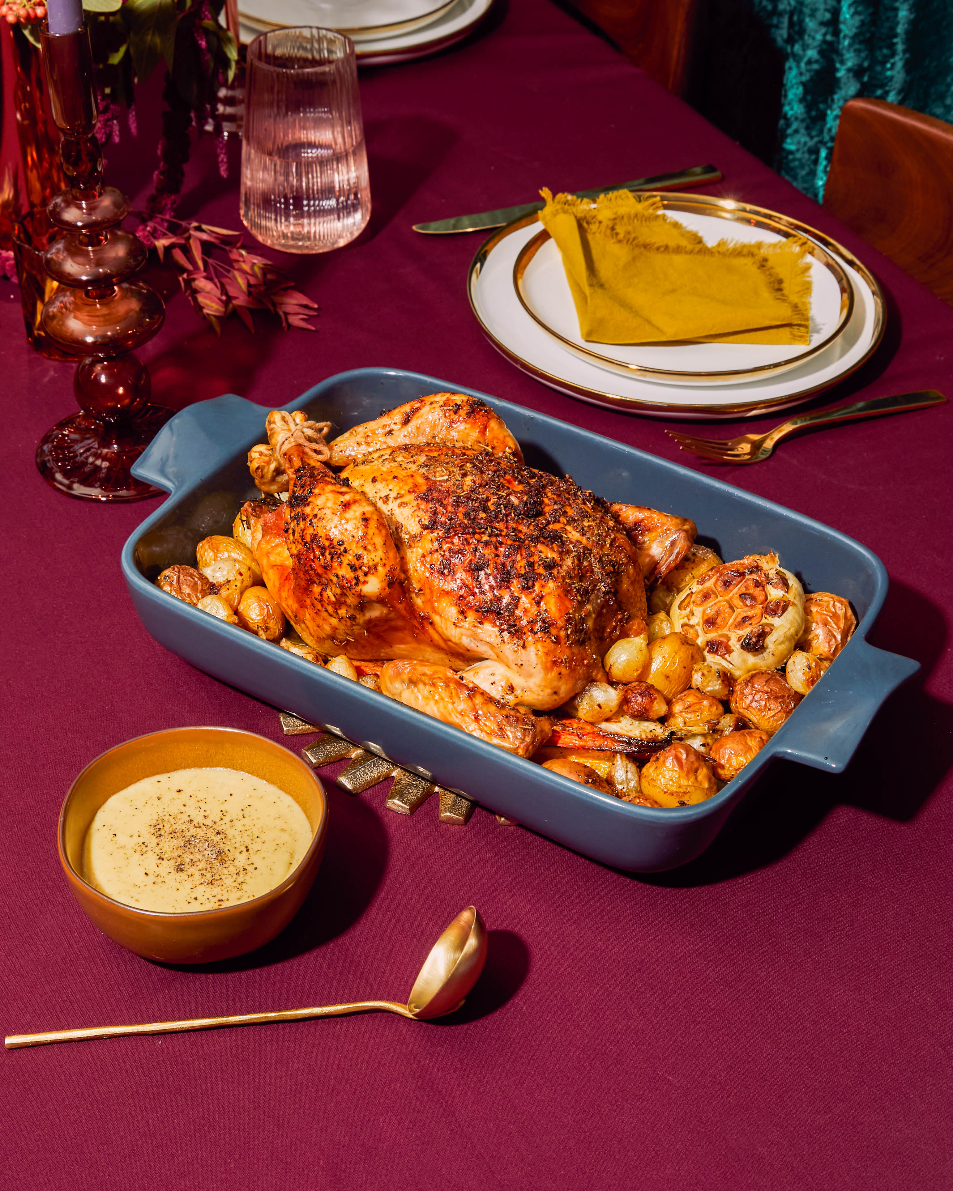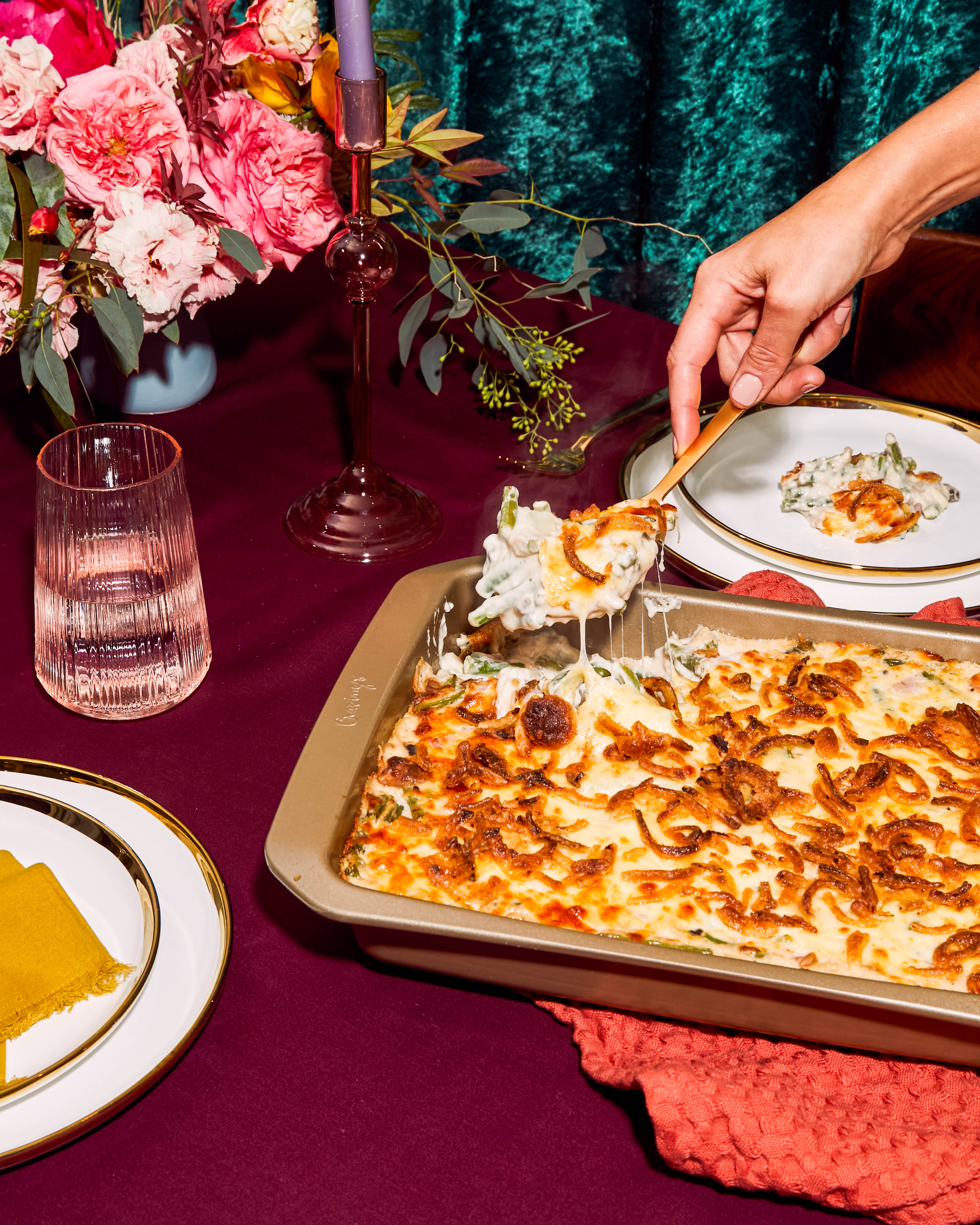 These are my top five favorites of all time. There’s a perfect garlicky-herb roast chicken (never turkey in this house!) with mom’s easy gravy, John’s famous mac ‘n’ cheese, his granny’s collard greens, cheeeesy green bean casserole, and the pie to end all pies: my sweet potato streusel pie. You can add anything else you like to your Thanksgiving menu—this is meant to build upon! There's always room for extra-buttery mashed potatoes, cranberry sauce, stuffing (I'm partial to a box of Stove Top...), and a festive beverage like fall rosé sangria (with wine or berry-flavored sparkling water for if you’re not drinking). But that’s it! Thanksgiving is handled. You’re welcome.