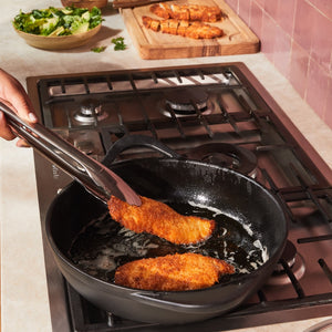 Bread and Fry the Chicken: Pour enough canola oil into a cast iron pan so that it is about ¾-inch deep. Heat over medium-high heat until it reaches a temperature of about 370°F.